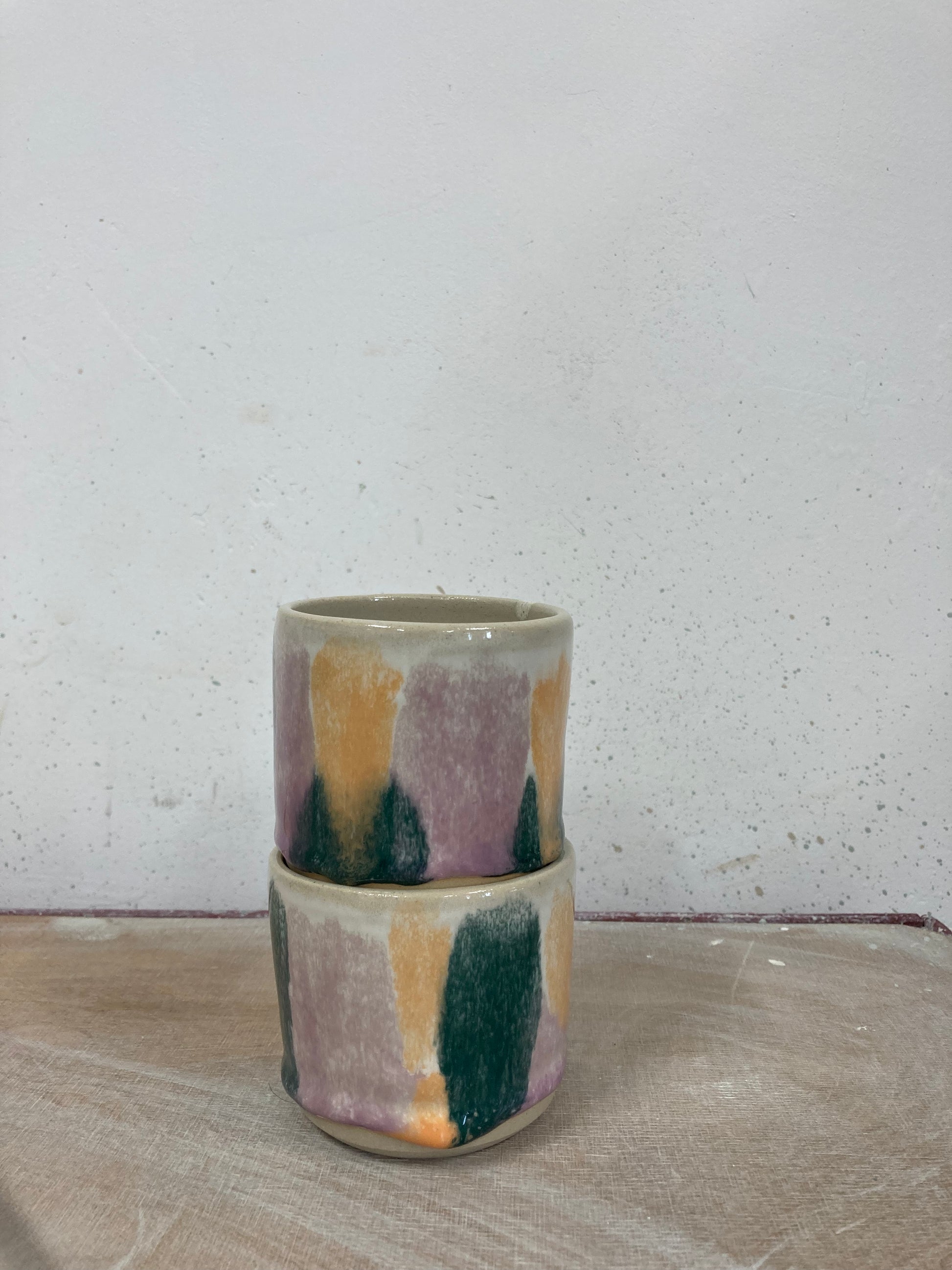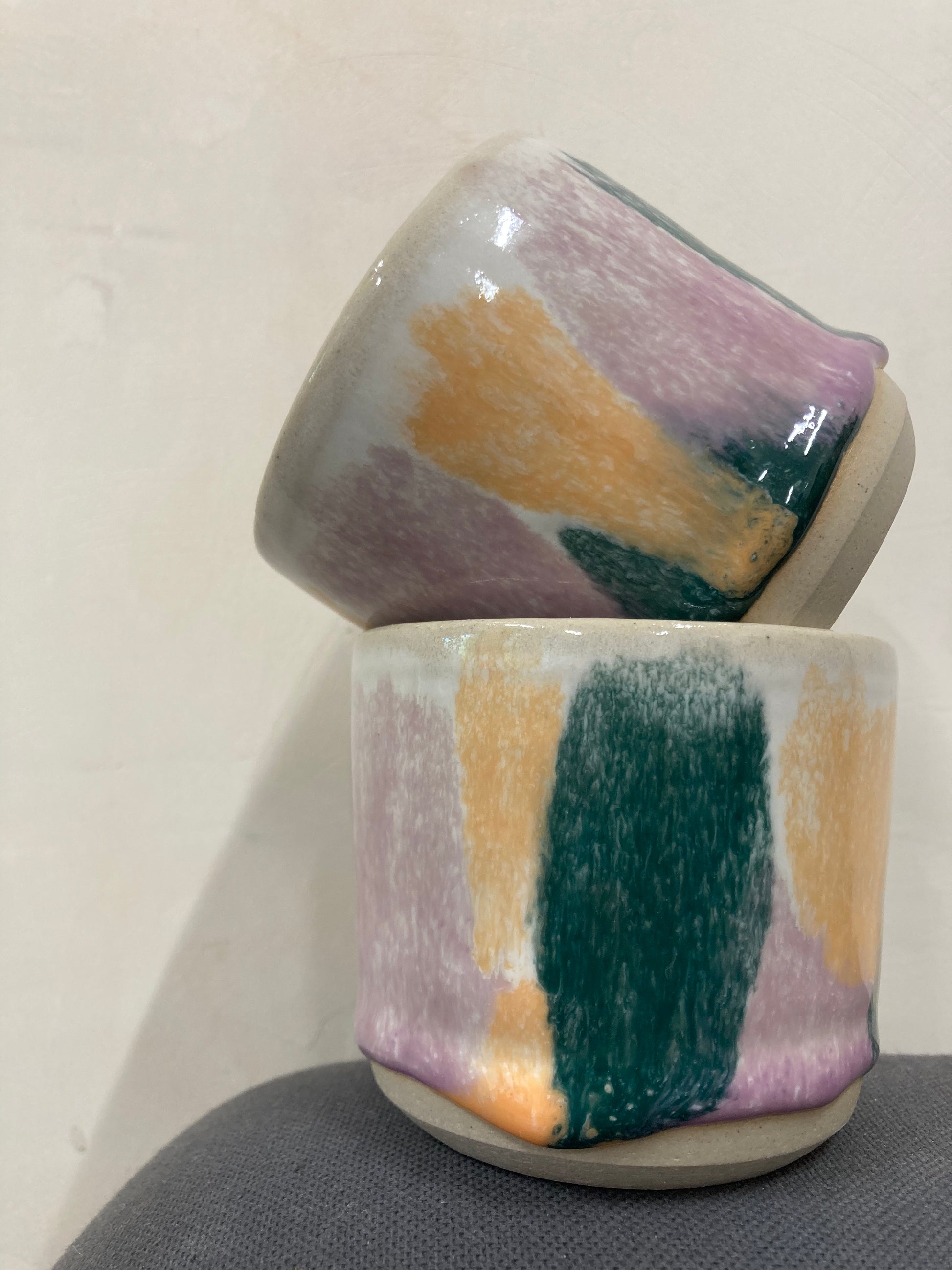 Leicht bauchiger Becher mit zarter lila-grün-gelber Glasur. Toller Farbverlauf und Glasurtropfen. Perfekt für deinen ruhigen Moment im Alltag. Spülifest. Füllmenge ca 200-250ml.