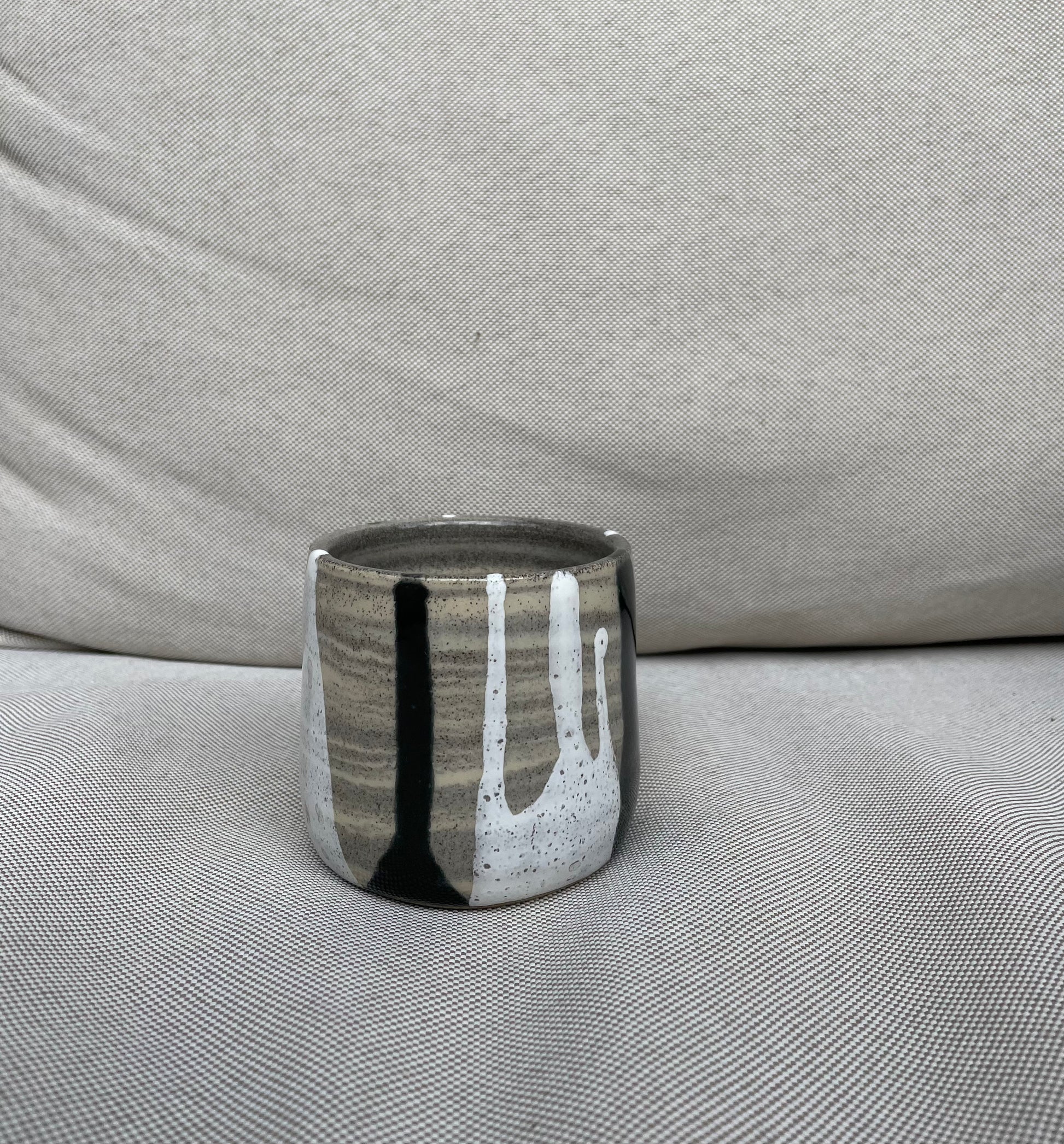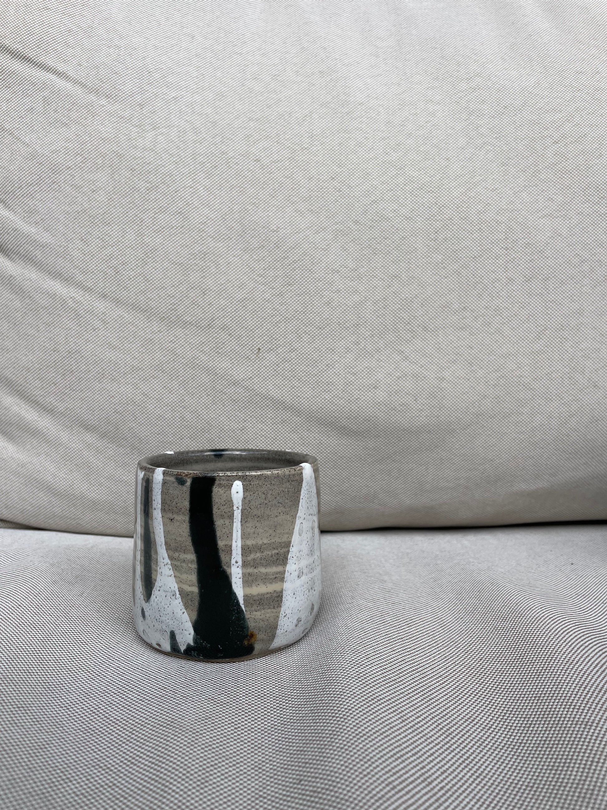 Gerader Becher aus marmoriertem Ton mit schwarzem und weißem Farbverlauf. Unikat. Liegt durch die Form angenehm in der Hand. Perfekt für deinen ruhigen Moment im Alltag. Spülifest.
