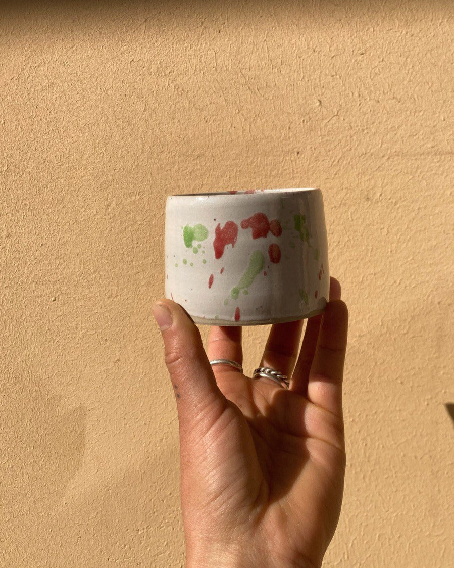 Zylinderförmiger Cappuccino Becher in rot - grün gefreckled. Perfekt für deinen ruhigen Moment im Alltag. Spülifest.