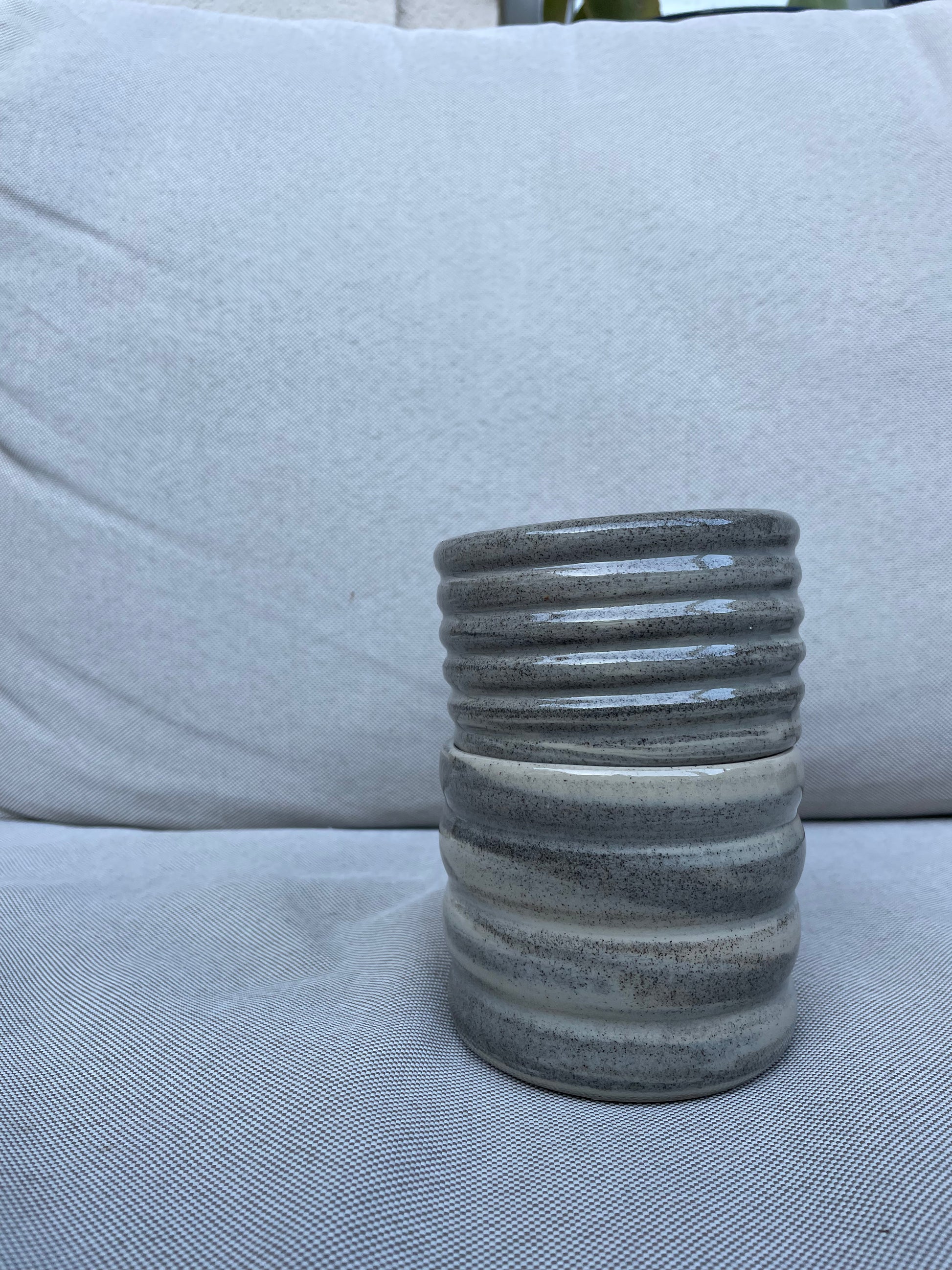 Wobbeliger Cappuccino Becher aus marmoriertem Ton. Liegt durch die Form angenehm in der Hand. Perfekt für deinen ruhigen Moment im Alltag. Spülifest.