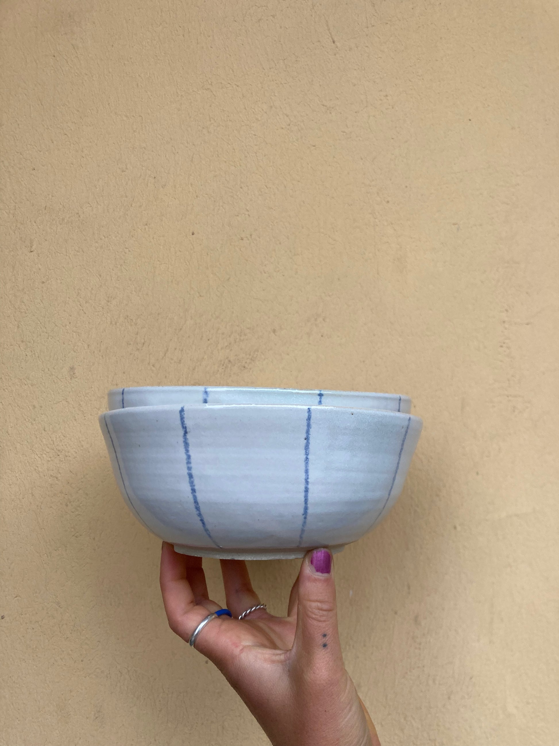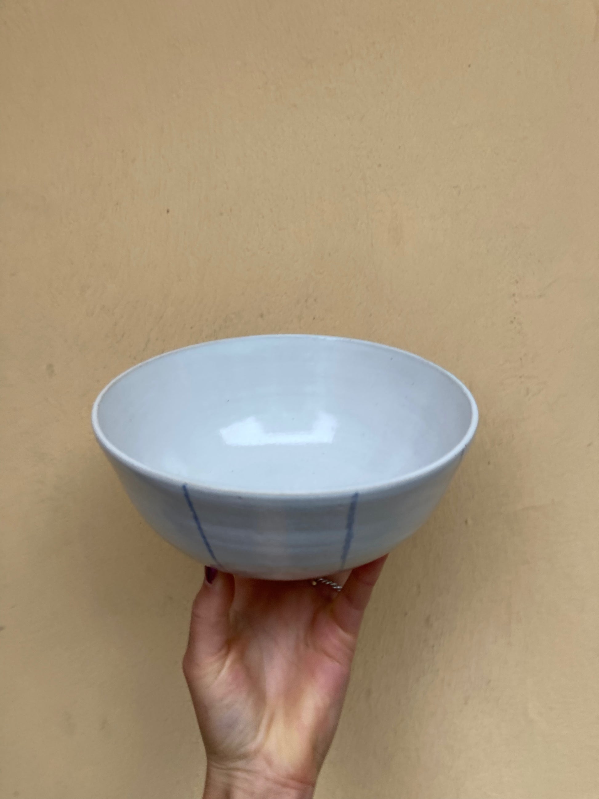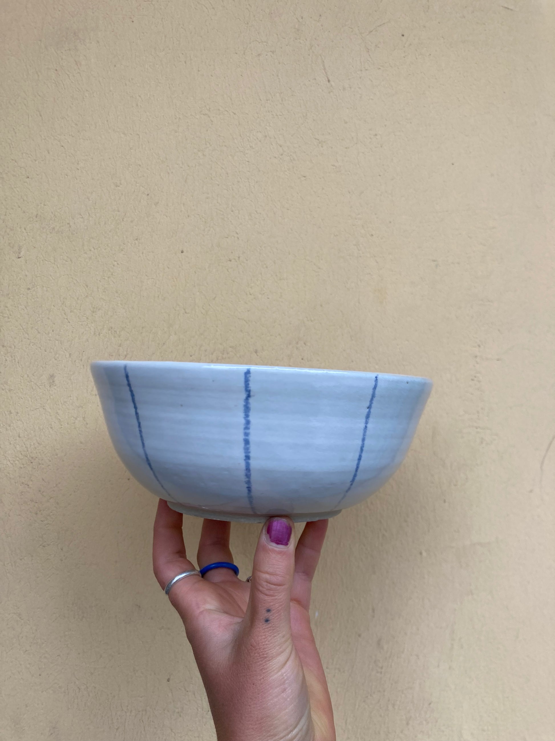 Schlichte Müslischale in weiß mit handgemalten feinen blauen Linien. Super Größe für Müsli, Salat oder eine Suppe. Perfekt für deinen ruhigen Moment im Alltag. Spülifest.