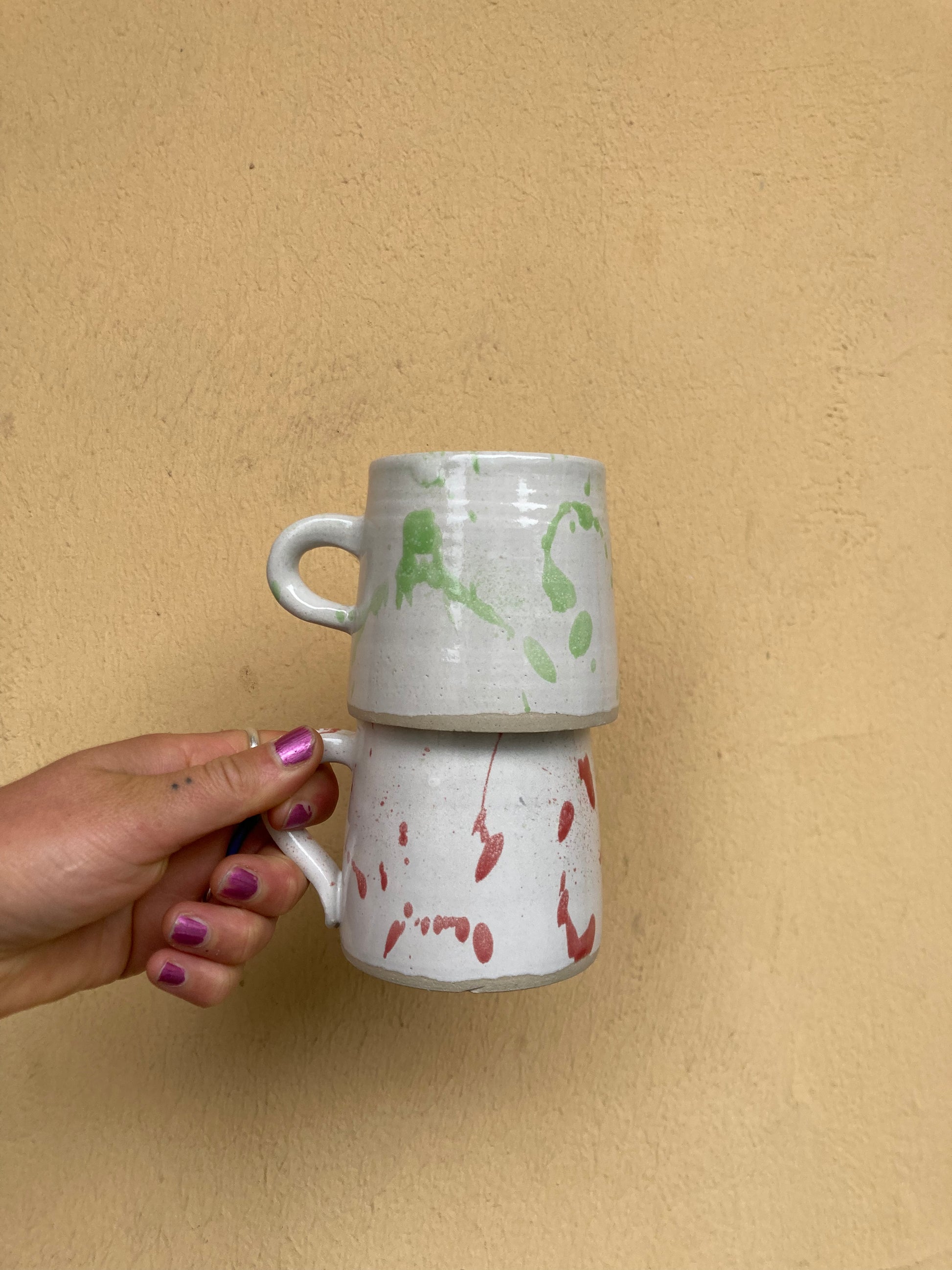 Zylinderförmige Cappuccino Tasse in rot oder grün gefreckled. Perfekt für deinen ruhigen Moment im Alltag. Spülifest.