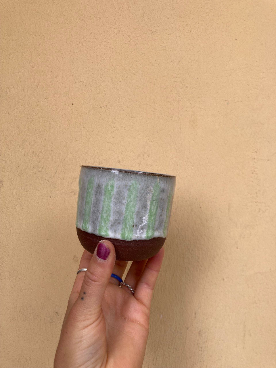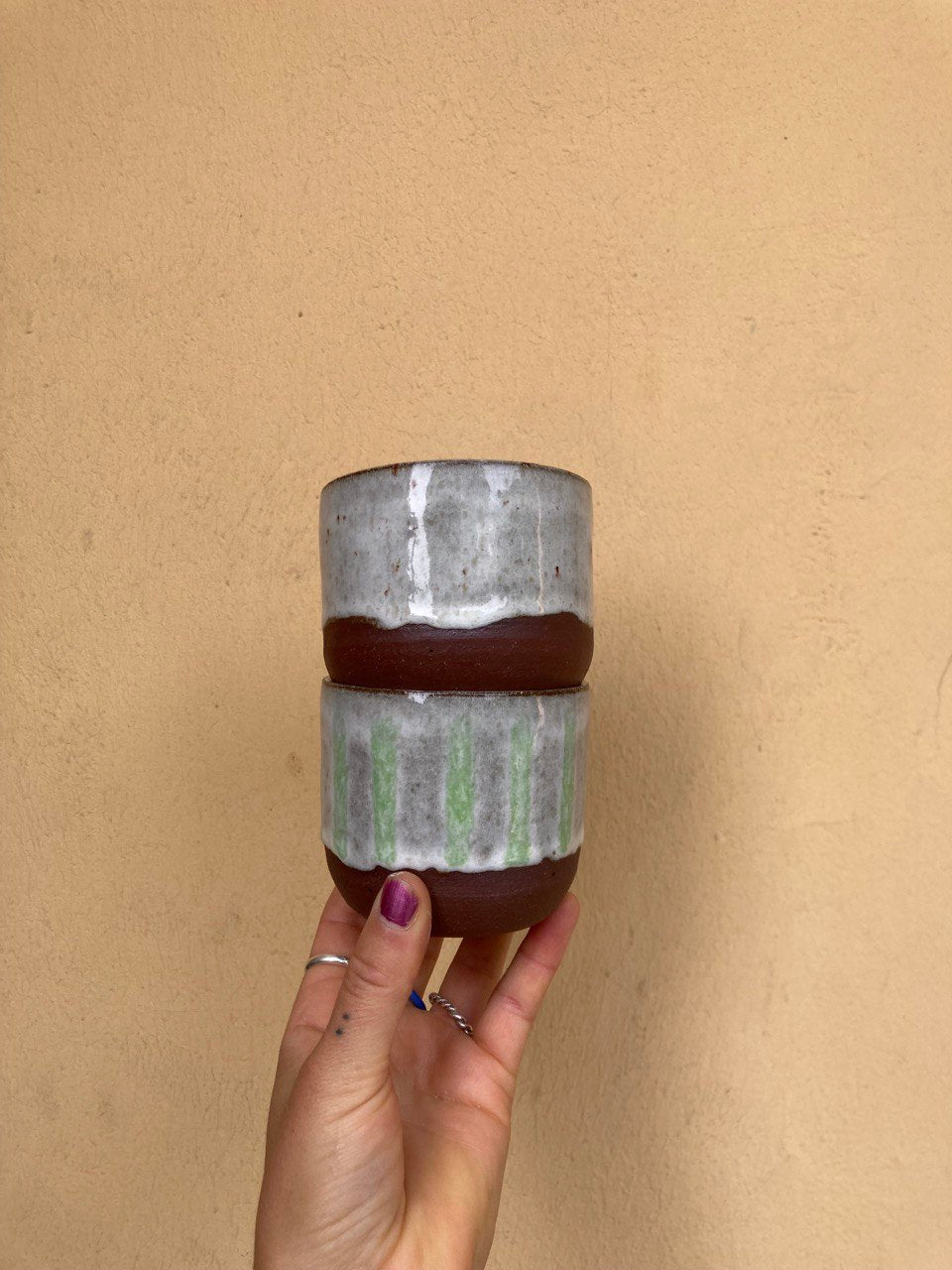 Terrakottafarbener Cappuccino Becher in zwei Varianten. Ganz weiß oder weiß mit hellgrünen Streifen. Perfekt für deinen ruhigen Moment im Alltag. Spülifest.