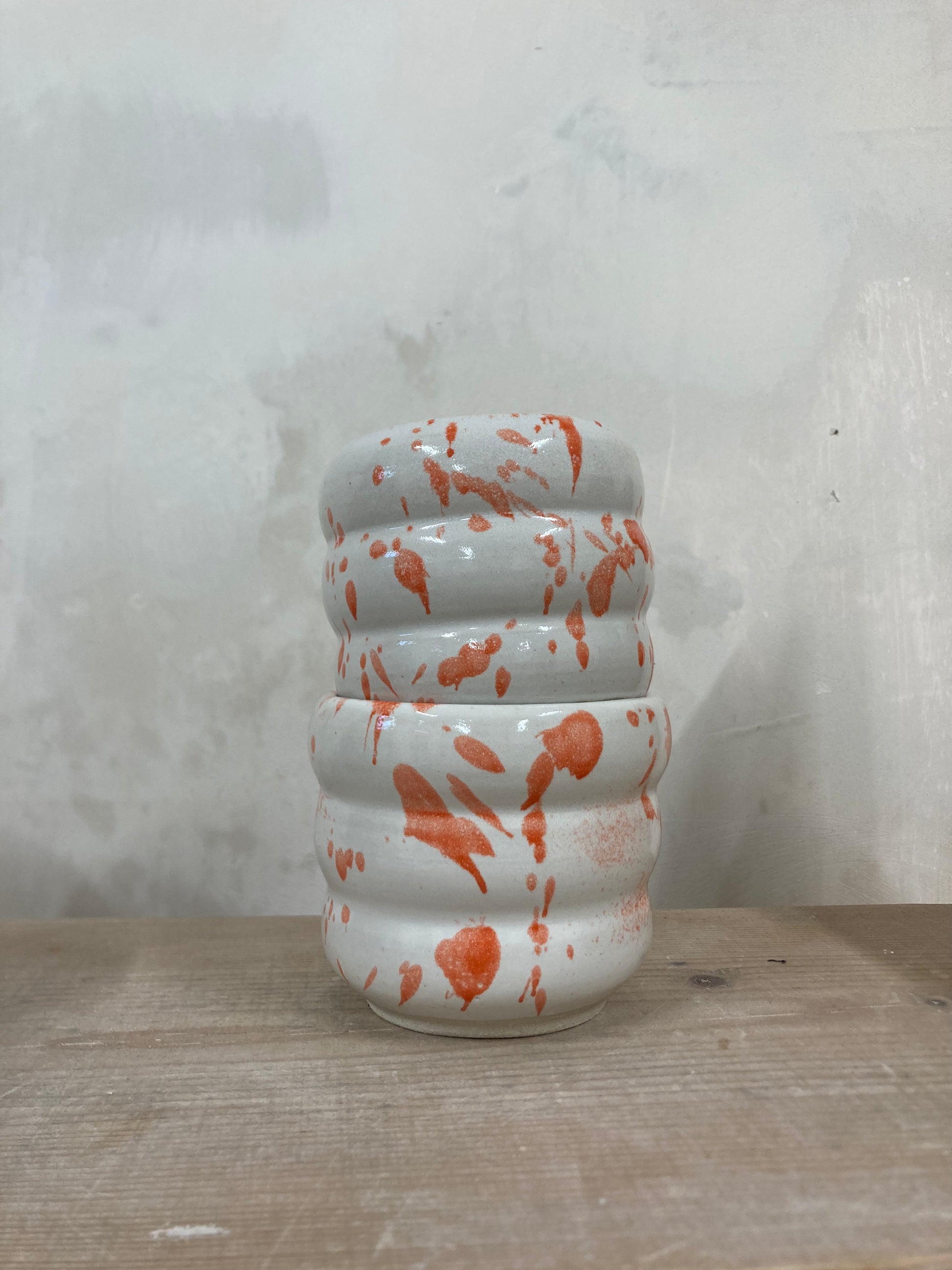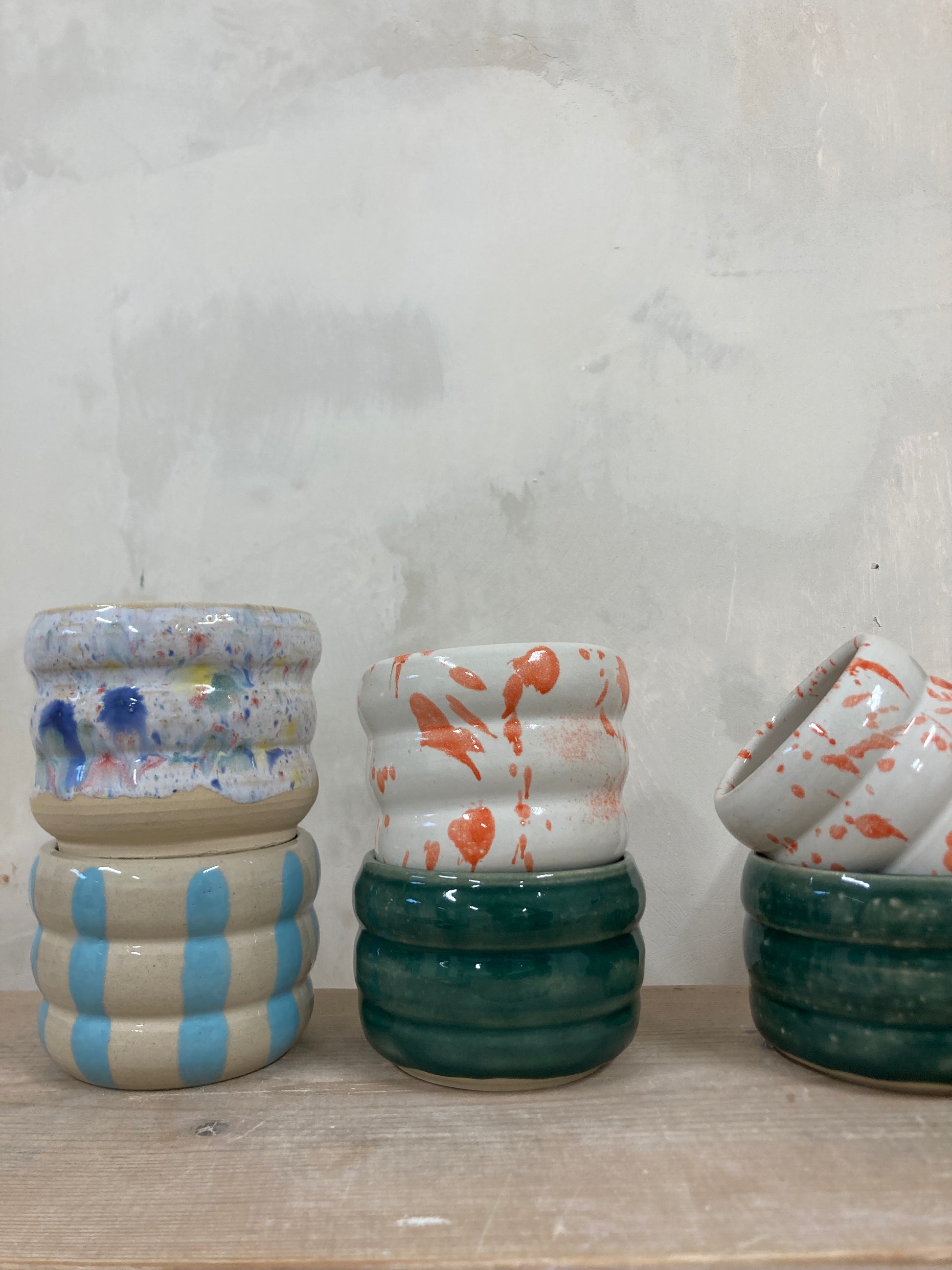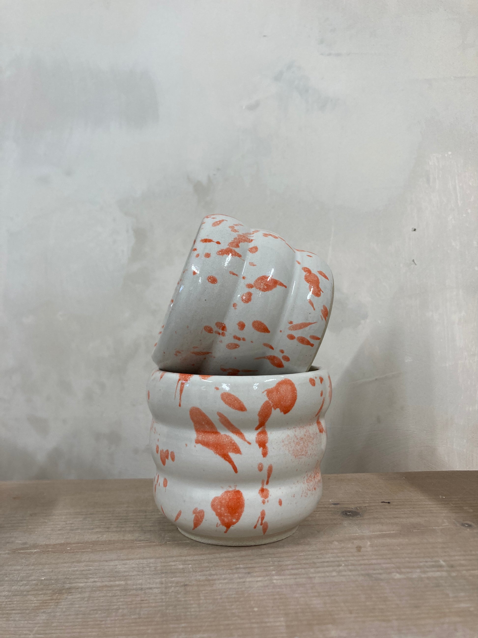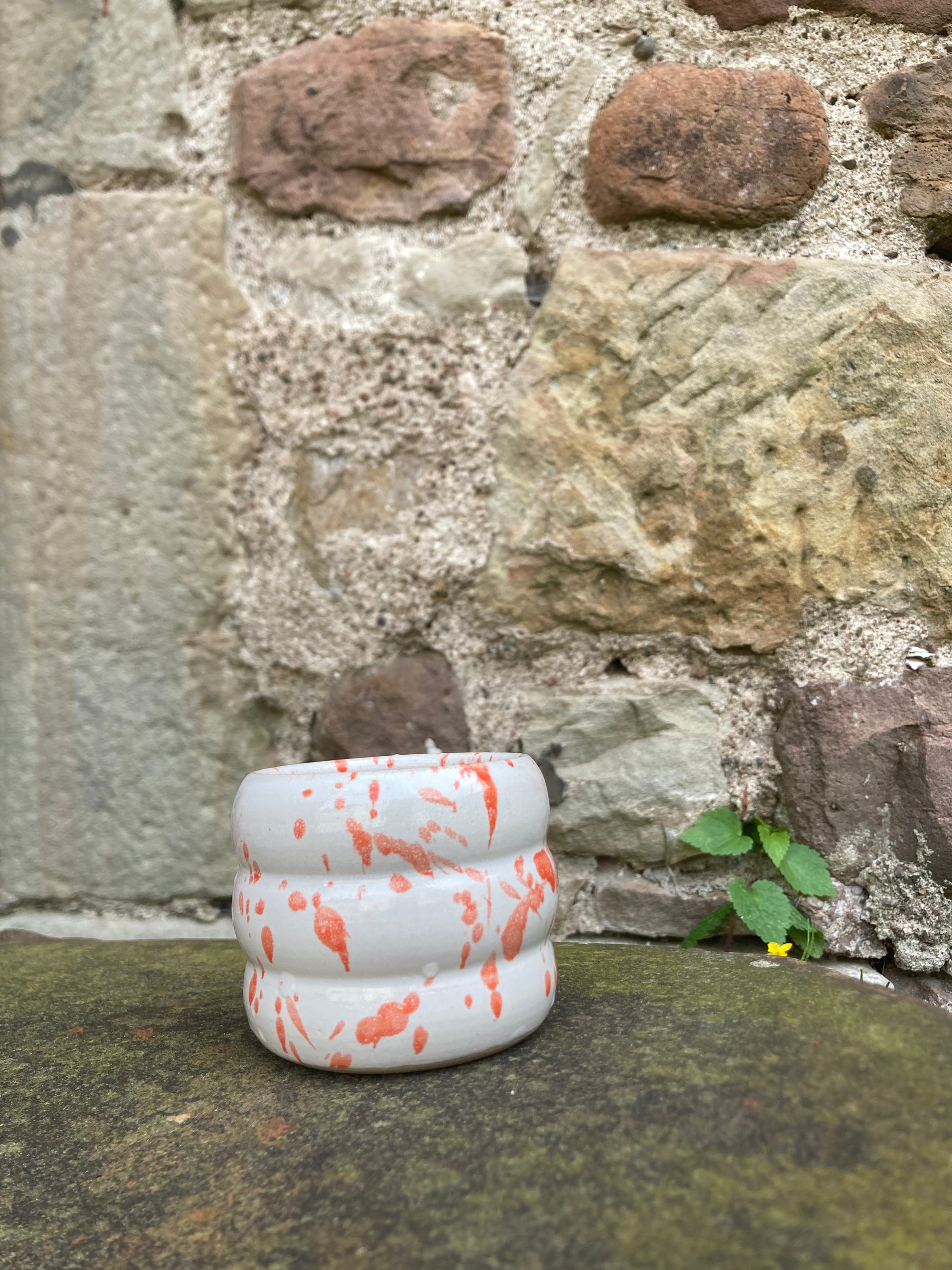 Wobbeliger Cappuccino Becher in orange gesprenkelter Glasur. Perfekt für deinen ruhigen Moment im Alltag. Spülifest.